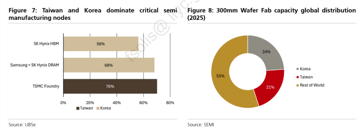 La industria tecnológica suele hablar de diversificación, pero la realidad sigue siendo muy concentrada. Taiwán mantiene una posición dominante en fundición avanzada. Corea, al mismo tiempo, controla buena parte de la memoria de alto rendimiento que hoy necesita la IA para escalar. UBS recuerda que TSMC se movía cerca del 70% de cuota en fundición, mientras Samsung y SK Hynix reunían alrededor del 68% del mercado de DRAM y SK Hynix acumulaba cerca del 56% de los ingresos de HBM. Además, entre Taiwán y Corea sumaban alrededor del 45% de la capacidad global de fabs de 300 mm en 2025.