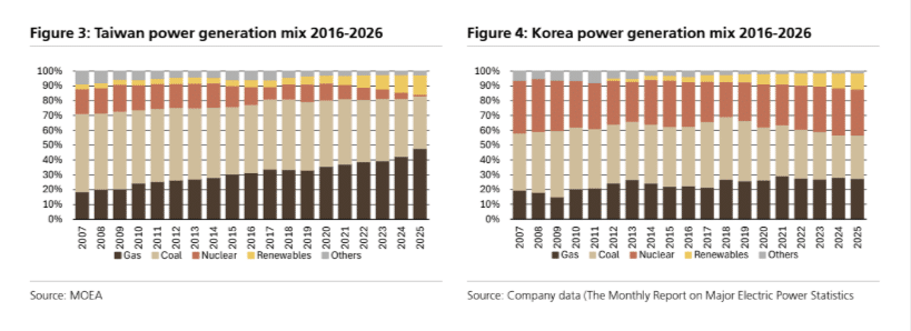 El mix eléctrico actual muestra una mayor dependencia del gas en Taiwán y una base más equilibrada en Corea.
