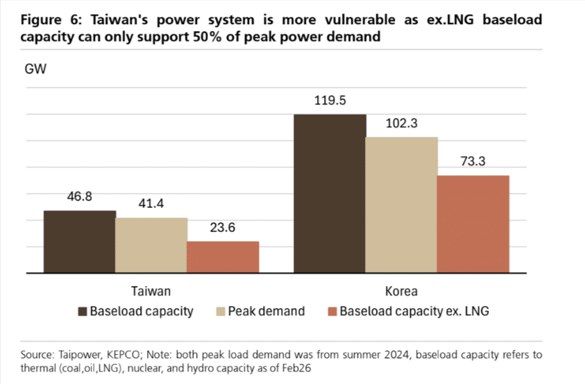 Hay una gráfica del informe que condensa casi todo el argumento. UBS muestra que, si se excluye el LNG, la capacidad base de Taiwán solo cubriría aproximadamente el 50% de la demanda pico. Corea también sufriría, pero partiría de una posición menos frágil. La conclusión es incómoda y bastante clara. El LNG no es un complemento. Es una pieza crítica de equilibrio.